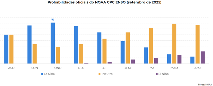 Para os próximos meses, o Climate Prediction Center – NOAA (CPC) dos EUA elevou a probabilidade para 71% de uma transição das condições neutras para La Niña, para o período de outubro a dezembro de 2025. “Na África Ocidental, esse fenômeno climático tende a favorecer maior umidade relativa e temperaturas ligeiramente mais amenas, o que pode contribuir para menores chances de estresse hídrico nas lavouras de cacau durante a estação seca que se aproxima. É importante estar atento aos efeitos do La Niña em dezembro, período que marca o início dos ventos Harmattan, os quais podem comprometer a integridade dos frutos”, diz França.
