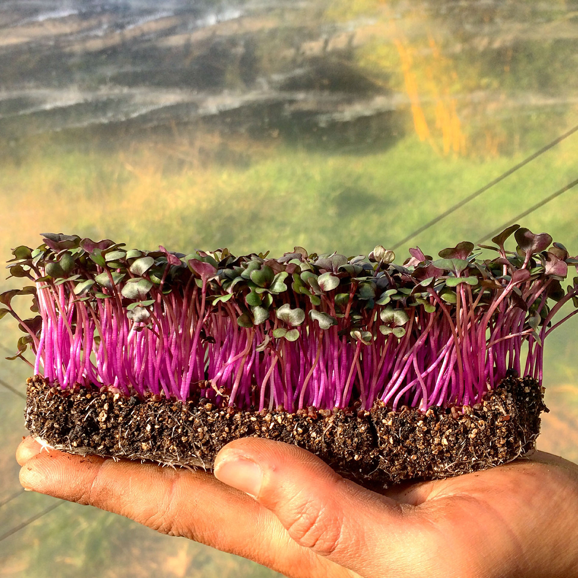 Por esse motivo, os microverdes hidropônicos são produzidos sobre tapete fino de fibra de coco, placas de espuma fenólica que mantêm a semente no lugar e retêm um pouco de umidade para germinação.