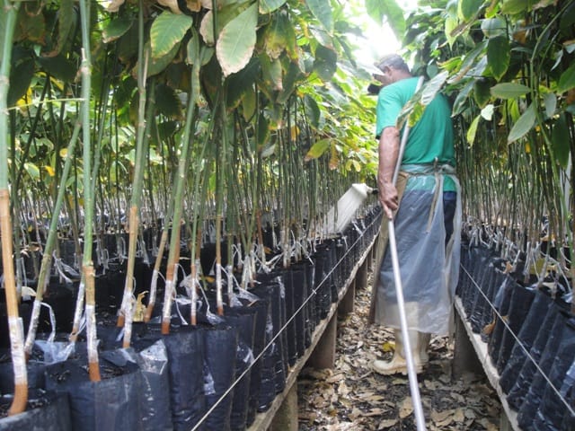 Além disso, tem que ter um rigoroso controle de pragas, com pulverizações com agrotóxicos para o controle principalmente de antracnose e de insetos.No primeiro ano o viveirista normalmente tem tido dificuldade para dominar totalmente a nova tecnologia, mas a partir do segundo ano isso já ésuperado.