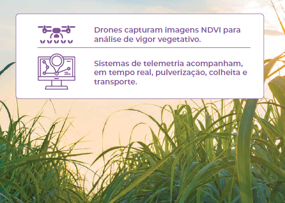 Drones capturam imagens NDVI para análise de vigor vegetativo. Sistemas de telemetria acompanham, em tempo real, pulverização, colheita e transporte.