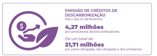 O RenovaBio estrutura a monetização dessa descarbonização, com meta de emissão de 48,1 milhões de CBIOs em 2026. Dados da B3 até o dia 04 de fevereiro indicam a emissão de 4,27 milhões de créditos pelos produtores de biocombustíveis. No momento, a quantidade de CBios disponível para negociação em posse da parte obrigada, não obrigada e dos emissores totaliza 21,71 milhões de créditos de descarbonização.