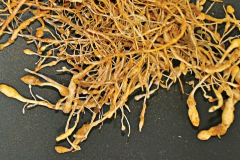 Em plantas de soja parasitadas por nematoides de cisto, podem-se observar os cistos de coloração marrom a dourada nas raízes, um indicativo do ataque do nematoide.