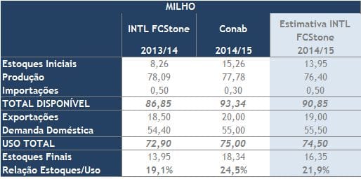 Com essa produção de 76,4 milhões de toneladas e considerando um consumo interno de 55,5 milhões de toneladas e um volume exportado de 19 milhões de toneladas, estimam-se estoques finais de 16,35 milhões de toneladas para o ciclo 2014/15, o que resultaria numa relação estoque/uso de 21,9%. Destaca-se que os estoques iniciais foram ajustados para baixo, após a revisão das exportações da safra 2013/14 para 18,5 milhões de toneladas.