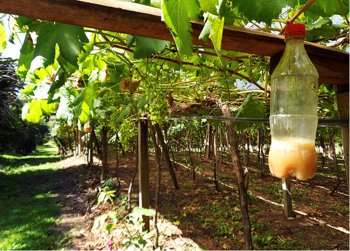 A técnica consiste na instalação de 100 a 120 armadilhas por hectare em todo o parreiral (o produtor pode aumentar a densidade nas bordas mais infestadas), utilizando como atrativo a proteína hidrolisada de origem animal em seu interior. Depois de entrar na armadilha, o inseto não localiza mais a saÃda e morre afogado, sem a necessidade de uso de inseticidas químicos. Existem armadilhas que podem ser compradas, mas, para baratear o uso da técnica, a equipe de pesquisa ensina a fazer armadilhas caseiras, com a reutilização de embalagens transparentes de refrigerantes (veja circular técnica). “Para utilizar as embalagens, basta fazer dois orifÃcios de sete milÃmetros em lados opostos. Depois colocar o atrativo e pendurar a armadilha no parreiral“, orienta Ruben Machota Junior, pós-doutorando na Embrapa Uva e Vinho que integra a equipe de pesquisa.