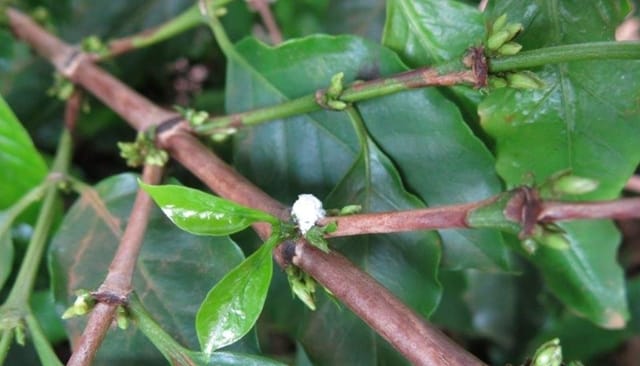 Durante a primavera de 2014, no município de João Pinheiro (MG), foram observadas colônias de uma cochonilha pouco habitual no cafeeiro e diferente daquelas comumente encontradas. As brotações, botões florais e frutos no estágio de chumbinho apresentavam massas cotonosas de cor branca e uma teia sobre elas.