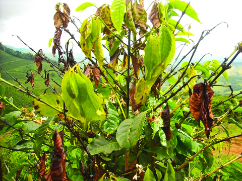 Nota-se maior severidade em plantas novas, mas lavouras velhas podadas também podem ser vulneráveis. Nas folhas velhas, os sintomas da doença são manchas de conformação irregular, de coloração pardo-escuro, envolvidas por um halo amarelo circundando as lesões, que é característico da doença.