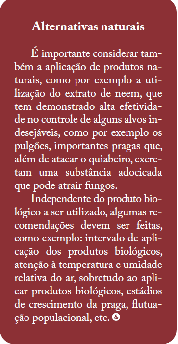Deve ser priorizado o uso de inimigos naturais das pragas, como predadores, parasitoides e entomopatógenos, para reduzir a população de pragas. Evitar o uso de inseticidas sintéticos. Embora recomendado com frequência, muitos destes inseticidas afetam a população dos inimigos naturais já existentes no local.