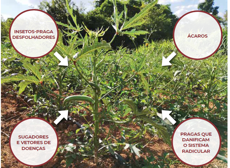 Entre as insetos-pragas que afetam o quiabeiro, destacam-se aquelas que atacam folhas, hastes, flores e frutos, como mosca branca, pulgões, ácaros, tripes, lagartas (como Helicoverpa e lagarta-rosada), cigarrinha-verde e vaquinha.