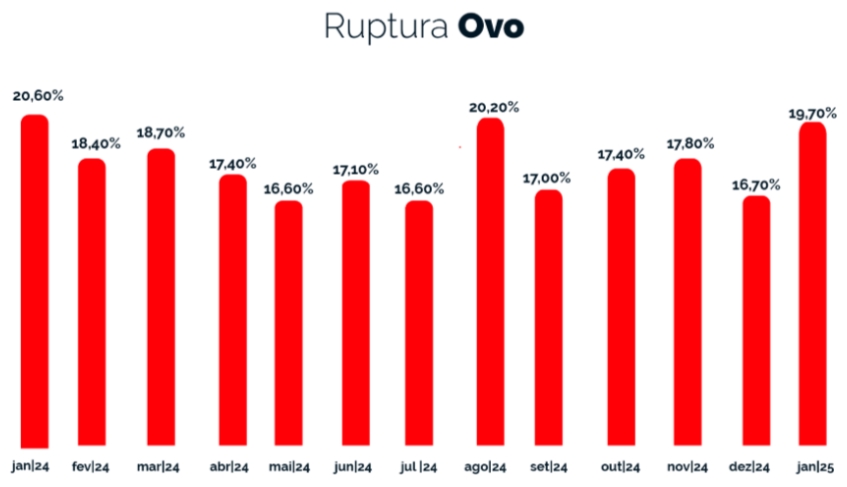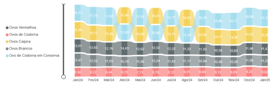 A indisponibilidade dos ovos aumentou 3 p.p., crescendo de 16,7% em dezembro de 2024 para 19,7% em janeiro de 2025. Nos preços, os ovos brancos tiveram um leve reajuste, subindo de R$ 11,06 para R$ 11,25. Já os tipos caipira e de codorna registraram queda, passando de R$ 13,43 para R$ 15,05 e de R$ 9,22 para R$ 8,26, respectivamente.