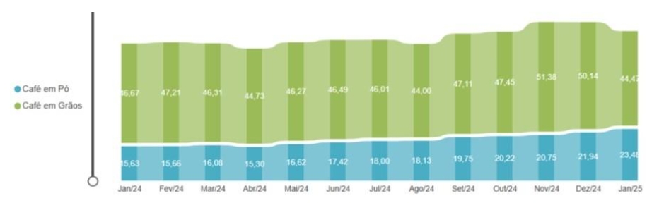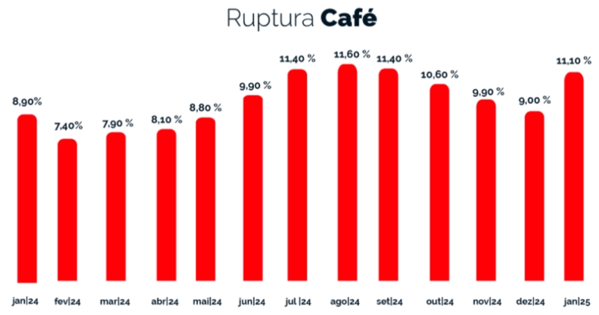 A ruptura de algumas marcas e tipos de café cresceu, atingindo 11,1% em janeiro – aumento de 2,1 p.p. ante o mês anterior. Em relação aos preços, o consumidor segue experimentando um amargor extra no bolso, já que o produto teve uma variação média de até 66% ao longo de 2024. Na lista deste mês, o valor do café em pó subiu 7%, passando de R$ 21,94 para R$ 23,48, enquanto o café em grãos teve uma redução, caindo de R$ 50,14 para R$ 44,47.
