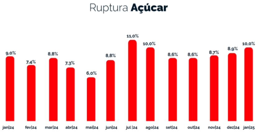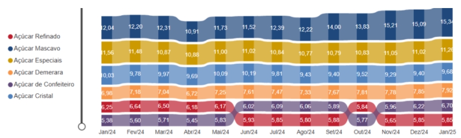 A indisponibilidade do açúcar subiu 1,1 p.p. em janeiro, chegando a 10% e retomando ao nível de agosto de 2024 depois de um período de estabilidade entre setembro e dezembro. Em relação aos preços, o açúcar cristal variou 2,9%, passando de R$ 9,40 para R$ 9,68. O mascavo também teve alta, saindo de R$ 15,09 para R$ 15,34, ao passo que o refinado se manteve estável em R$ 5,85.