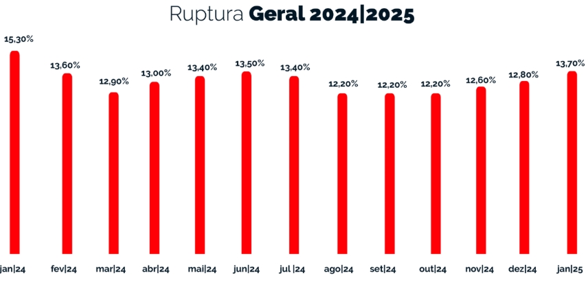 O Índice de Ruptura da Neogrid, indicador que mede a falta de produtos nas gôndolas dos supermercados brasileiros, registrou aumento em janeiro e a ruptura geral chegou a 13,7% – variação de 0,9 ponto percentual (p.p.) em relação a dezembro do ano passado. Este é o primeiro resultado superior a 13% desde agosto de 2024, após meses de estabilidade do índice na faixa dos 12% – nos últimos três meses, o indicador já vinha mostrando uma tendência de crescimento. Um dos destaques em aumento de ruptura é o café em janeiro, que subiu 2,1 p.p. ante o mês anterior, e que apresenta variação de preço de 66% em relação aos últimos 12 meses.