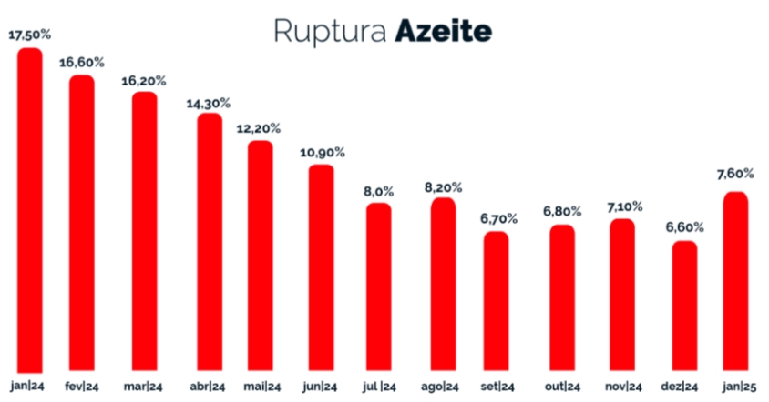 Após meses de equilíbrio e tendência de queda monitorada desde julho de 2024, o azeite voltou a subir neste mês, registrando alta de 1 p.p. e alcançando 7,6% de ruptura. Apesar do aumento, o cenário é mais favorável que o do início do ano passado, quando o índice do produto era de 17,5%. Nos preços, o azeite de oliva virgem teve uma leve redução, de R$ 48,14 para R$ 47,91, enquanto o extravirgem subiu de R$ 49,44 para R$ 50,18.