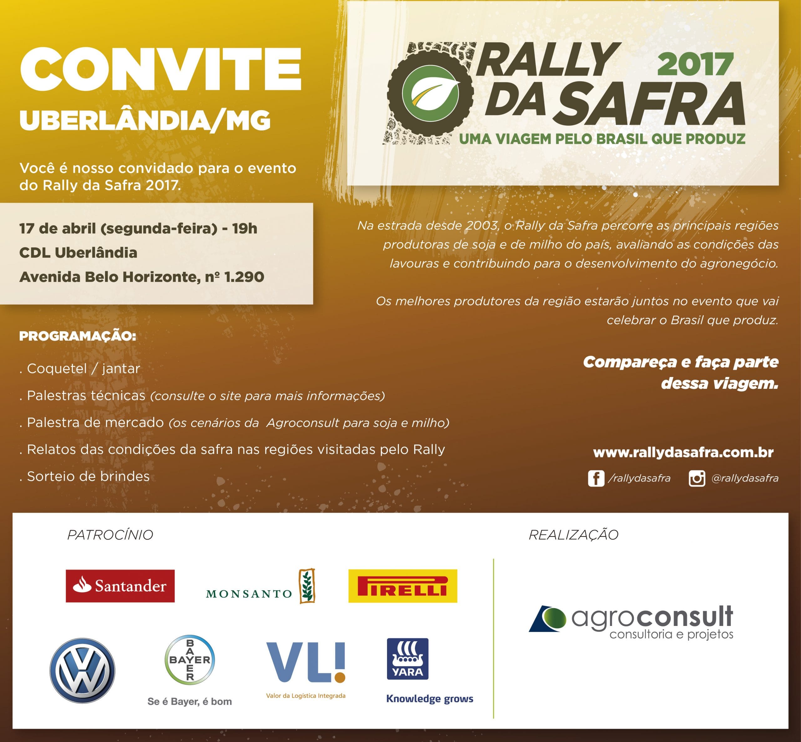 5.Convite_UberlandiaApós a conclusão da etapa de avaliação das lavouras de soja, o Rally da Safra prossegue este mês com a realização de eventos para produtores. O maior levantamento sobre a safra de grãos do Brasil fará em Uberlândia/MG, nesta segunda-feira, dia 17 de abril, às 19h, no CDL (Câmara dos Dirigentes Lojistas), evento com o sócio analista da Agroconsult, Marcos Rubin, que irá avaliar o cenário para o mercado de grãos no Brasil e apresentará os resultados obtidos em campo pelo Rally.  Acontecerão também palestras técnicas com os patrocinadores, sorteio de brindes e coquetel.