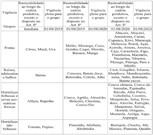 Todos os produtos que serão comercializados in natura deverão estar em conformidade com as novas regras sobre a rastreabilidade até 2021. Contudo, sob a aspecto de importância econômica de determinadas culturas, foi estabelecido um cronograma para a adequação.
