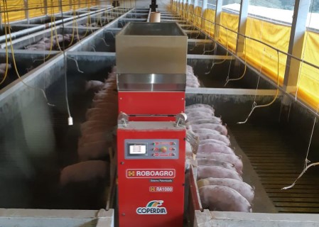 - Cada robô distribuidor de ração pode alimentar até 3 mil suínos em terminação.