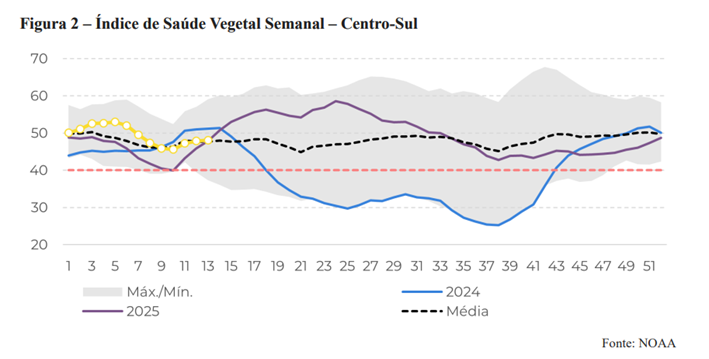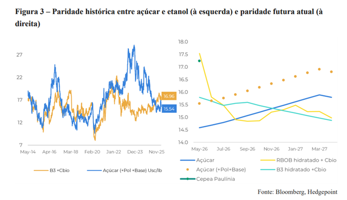 Nesse cenário, o piso efetivo do açúcar é estimado em torno de 13,5 centavos de dólar por libra, considerando o etanol hidratado ao redor de R$ 2,2 por litro, o que funciona como referência para o ajuste entre oferta e demanda ao longo da safra.