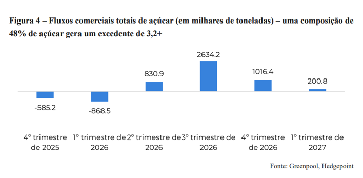 Em paralelo, o etanol recuperou competitividade em relação ao açúcar desde o final de 2025, incentivando ajustes no mix produtivo das usinas. Atualmente, o mercado opera com um mix próximo de 48% de açúcar, embora o nível necessário para equilibrar oferta e demanda esteja mais próximo de 44,5%, o que reforça o papel do etanol como principal alavanca de reequilíbrio.