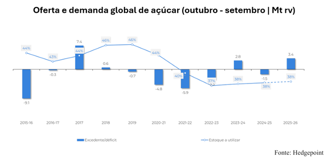 “Nossa visão é um pouco mais otimista, colocando a produção final mais perto de 610 Mt. Com uma mistura de açúcar de 50,6%, a produção total do adoçante se aproximaria de 40,5 Mt, ajudando a explicar o tom baixista predominante no mercado”, diz Lívea Coda, coordenadora de inteligência de mercado da Hedgepoint Global Markets.