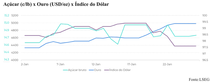 Já na última quinta-feira (22), o sentimento de aversão ao risco mudou depois que Trump anunciou a suspensão dos planos de impor novas tarifas à UE e esclareceu que os EUA não usariam a força para adquirir a Groenlândia. Isso foi, de forma geral, favorável às commodities, com exceção do complexo energético, que vinha se beneficiando da incerteza persistente. Os preços do açúcar se recuperaram 1,5% na quinta-feira, fechando a semana em um nível mais baixo de 14,7 c/lb na sexta feira (23).