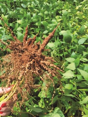 Em áreas que apresentam o nematoide-do-cisto-da-soja, cerca de 30-40 dias após a semeadura é possível observar pontuações de coloração branca nas raízes, que representam as fêmeas vivas.