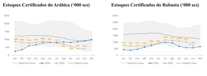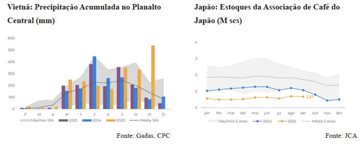 Os estoques certificados de arábica permanecem historicamente baixos, fechando a última semana em 406,9 mil sacas, uma queda de 54,96% no acumulado do ano. Os estoques de robusta também caíram, atingindo 755 mil sacas, enquanto a colheita no Vietnã segue atrasada devido às chuvas intensas e tempestades relacionadas ao fenômeno La Niña. Nos destinos, a situação não é diferente: os estoques da União Europeia recuaram para 7,8 milhões de sacas, o menor nível desde maio, e os estoques no Japão também estão abaixo da média histórica.