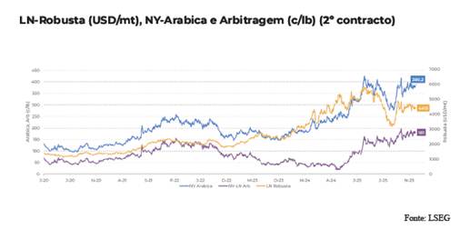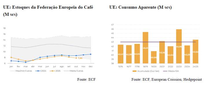 Apesar da escassez, a demanda mostra sinais de recuperação. O consumo aparente na UE encerrou a safra 24/25 acima da média de 10 anos e iniciou a temporada 25/26 com força, impulsionado pelo inverno no Hemisfério Norte. Esse cenário, aliado aos baixos estoques, deve sustentar os preços no curto prazo, com suporte para o contrato de março/26 em torno de 350 c/lb. No entanto, 2026 pode trazer correções, à medida que a safra 26/27 do Brasil se desenvolve bem e novos suprimentos do Vietnã e da América Central entram no mercado.