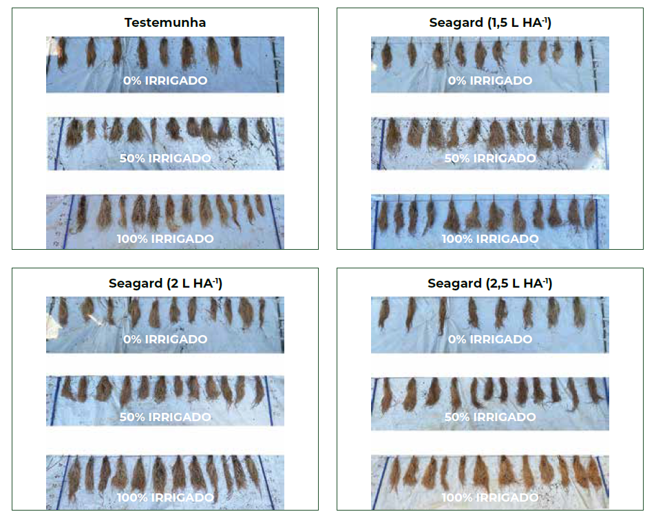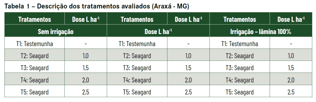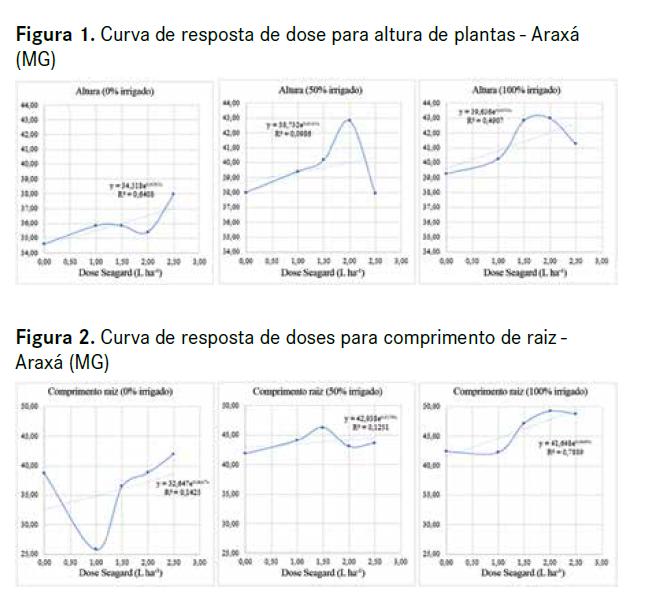 Nas condições edafoclimáticas da região de Araxá (MG), os resultados indicaram que: as maiores alturas de plantas, diâmetro de caule e comprimento de raízes foram obtidos com a dose de 2,0 L ha⁻¹ de Seagard, independentemente do nível de irrigação.