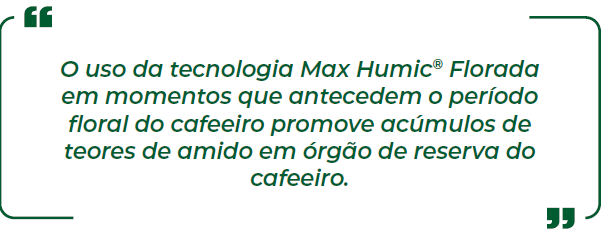 O uso da tecnologia Max Humic® Florada em momentos que antecedem o período floral do cafeeiro promove acúmulos de teores de amido em órgão de reserva do cafeeiro (Fronterra et al., 2024).