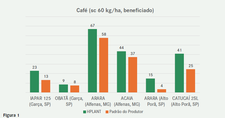 Em café, por exemplo, HPLANT® impacta positivamente fatores de produção como o comprimento dos ramos laterais, o número de gemas e a uniformidade de maturação dos frutos, resultando em um incremento médio de nove sacas de café beneficiado por hectare, conforme ilustrado na Figura 1, em algumas das principais variedades de café plantadas no Brasil, comparadas com as áreas não tratadas (padrão do produtor).