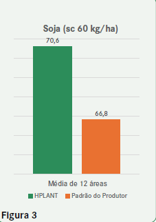 No milho, apresenta incrementos médios de produtividade de 0,5 t/ha, quando utilizado em aplicações foliares, no estádio V2-V3, comparados com as áreas não tratadas. Na soja, ensaios realizados em 12 diferentes regiões nesta última safra 2024/25, mostraram incrementos médios de 3,8 sacas por hectare, conforme ilustrado na Figura 3.