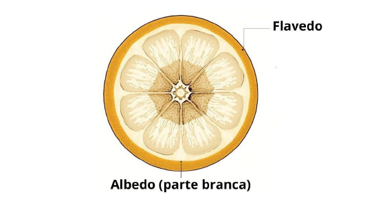 O albedo da laranja, camada branca que se combina com o flavedo para formar a casca, é rico em pectina, um polissacarídeo com propriedades gelificantes, espessantes e estabilizantes, utilizada nas áreas de alimentos, medicina e cosmético. Dentre os benefícios, incluem a redução do risco de doenças cardíacas, hipertensão, câncer de intestino, diarreia e toxinas, possui capacidade de formar filmes despertando interesse para aplicações na conservação de alimentos, além de fornecer fibras alimentares para uma melhor digestão, sendo considerado uma das frações mais promissoras do processamento da laranja (HOSSAIN et al., 2024).