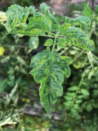 Nas folhas, a infecção pelo ToBRFV causa manchas irregulares, clorose (o verde perde intensidade e fica amarelada) e mosaico. As folhas podem ficar deformadas e mais finas. A intensidade de sintomas varia, explica ela, podendo ser vistos desde sintomas leves a severos.