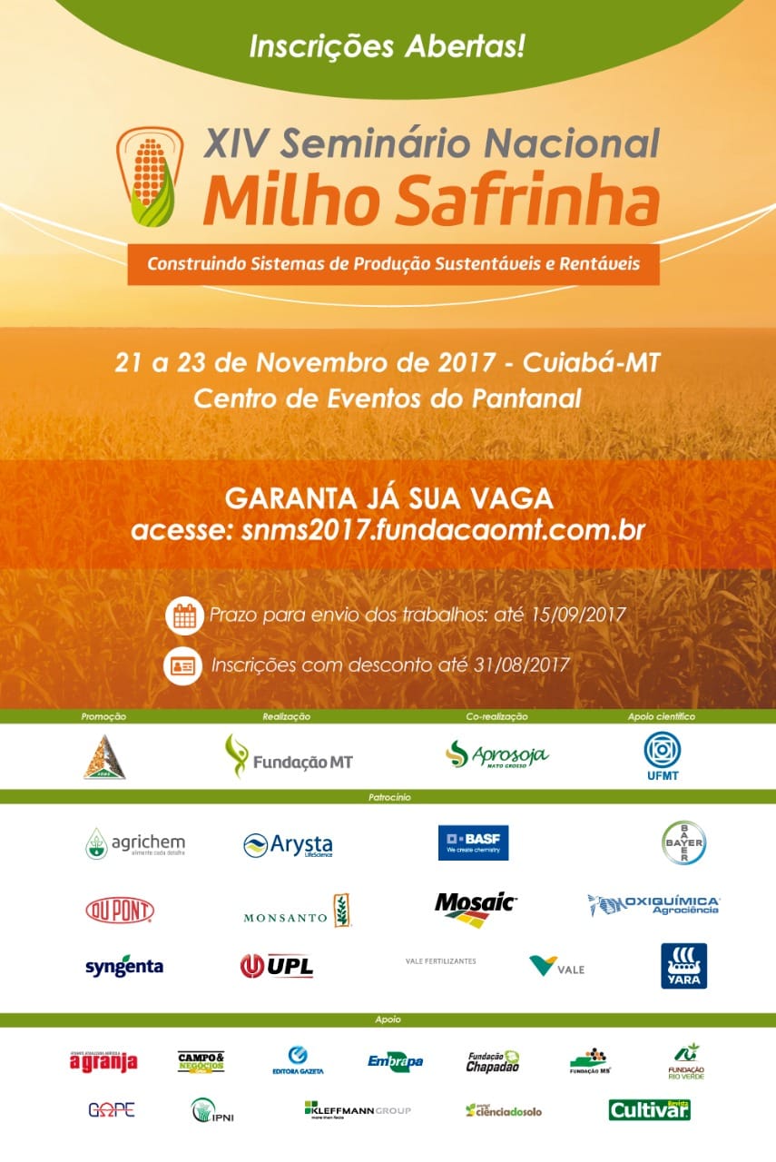 O Seminário acontecerá no Centro de Eventos do Pantanal, de 21 a 23 de novembro e as inscrições já estão abertas. A realização é da Fundação de Apoio à Pesquisa Agropecuária de Mato Grosso, Fundação MT, com co-realização da Aprosoja- MT, promoção da Associação Brasileira de Milho e Sorgo (ABMS) e apoio cientÃfico da Universidade Federal do Mato Grosso (UFMT), além do patrocínio de empresas e apoio de veículos de comunicação e instituições de pesquisa.