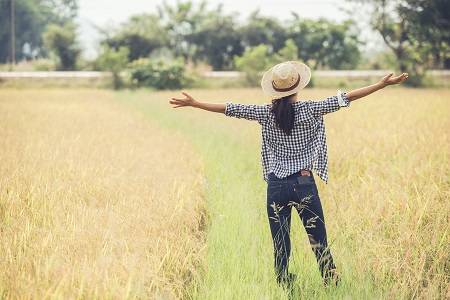The farmer is in the rice field and takes care of her rice.